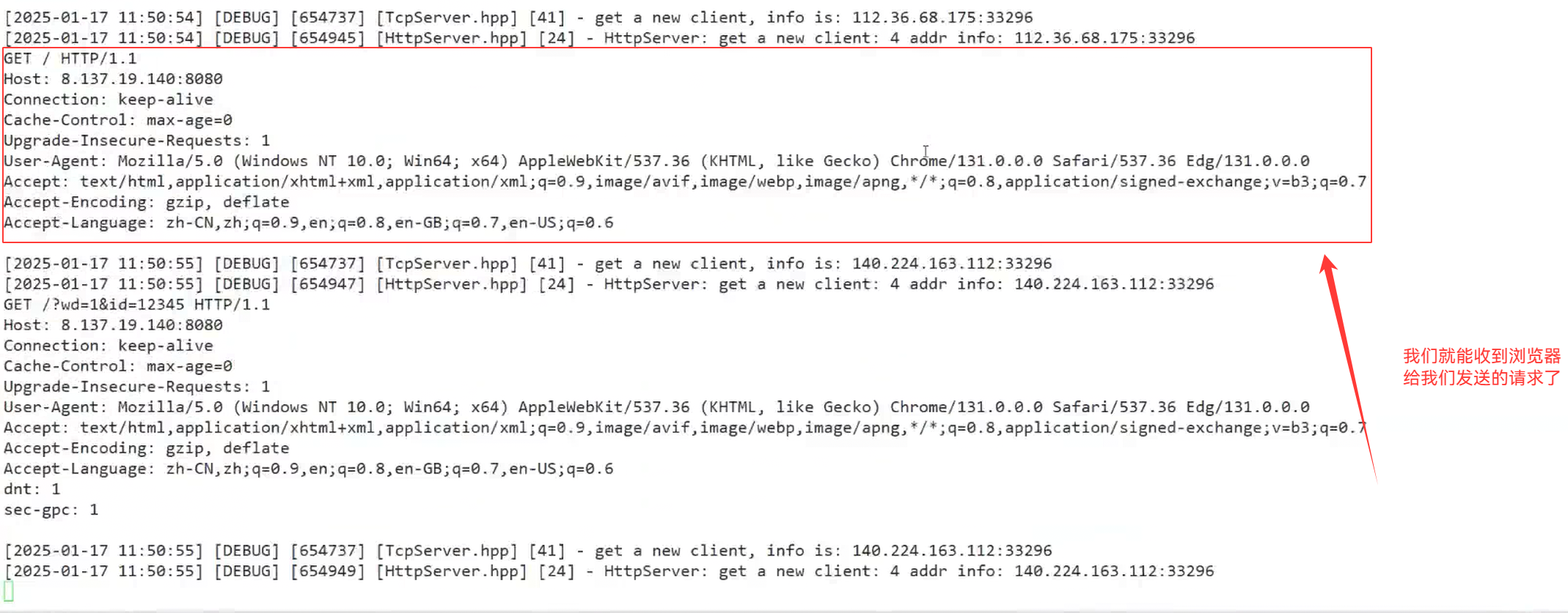 bool HandlerHttpRequest(SockPtr sockfd,InetAddr client){LOG(LogLevel::DEBUG) << "HttpServer: get a new client: " << sockfd->Fd() << " addr info: " << client.Addr();std::string http_request;sockfd->Recv(&http_request);std::cout << http_request;return true;}