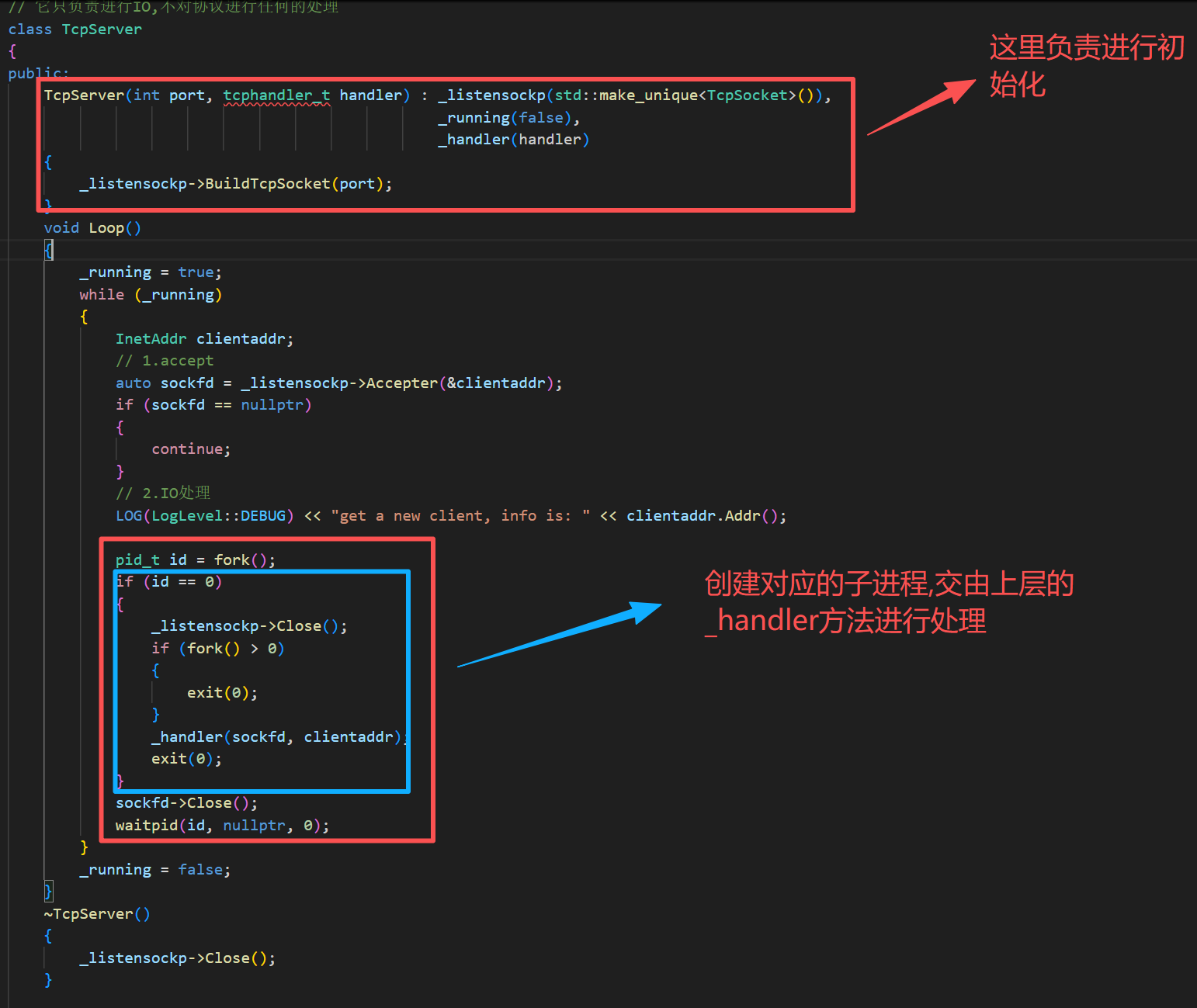 {using namespace SocketModule;using namespace LogModule;using tcphandler_t = std::function<bool(SockPtr, InetAddr)>;// 它只负责进行IO,不对协议进行任何的处理class TcpServer{public:TcpServer(int port, tcphandler_t handler) : _listensockp(std::make_unique<TcpSocket>()),_running(false),_handler(handler){_listensockp->BuildTcpSocket(port);}void Loop(){_running = true;while (_running){InetAddr clientaddr;// 1.acceptauto sockfd = _listensockp->Accepter(&clientaddr);if (sockfd == nullptr){continue;}// 2.IO处理LOG(LogLevel::DEBUG) << "get a new client, info is: " << clientaddr.Addr();pid_t id = fork();if (id == 0){_listensockp->Close();if (fork() > 0){exit(0);}_handler(sockfd, clientaddr);exit(0);}sockfd->Close();waitpid(id, nullptr, 0);}_running = false;}~TcpServer(){_listensockp->Close();}private:// 一定要有一个 Listensockstd::unique_ptr<Socket> _listensockp;bool _running;tcphandler_t _handler;};}