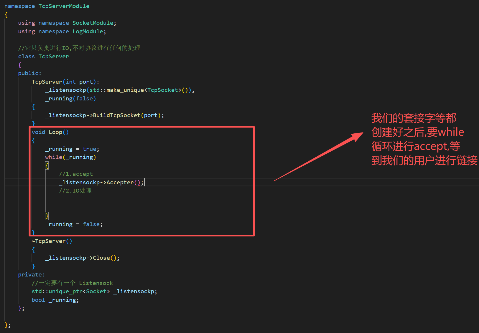 public:virtual ~TcpSocket() = default;virtual int SocketOrDie() = 0;virtual int SetSocketOpt() = 0;virtual bool BindOrDie(int listenscokfd) = 0;virtual bool ListenOrDie(int listenscokfd) = 0;virtual int Accepter(int listenscokfd) = 0;virtual void Close(int fd) = 0;private:};int main()