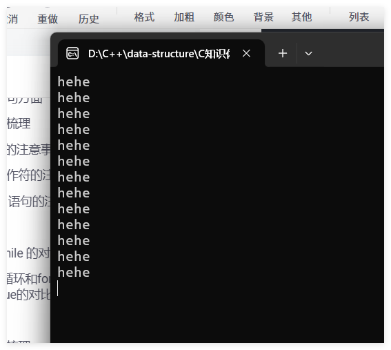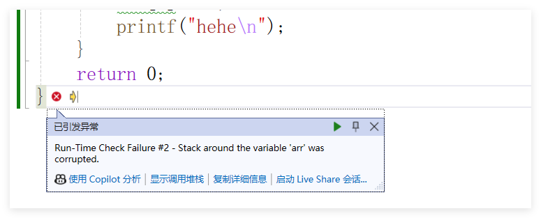 {int i = 0;int arr[10] = {1,2,3,4,5,6,7,8,9,10};for(i=0; i<=12; i++){arr[i] = 0;printf("hehe\n");}return 0;