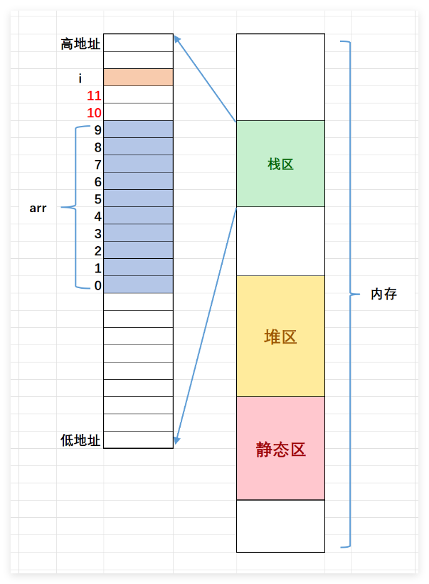 栈区:栈区内存的使⽤习惯是从高地址向低地址使⽤的,所以变量i的地址是较大的。arr 数组的地址整体是小于 i 的地址。