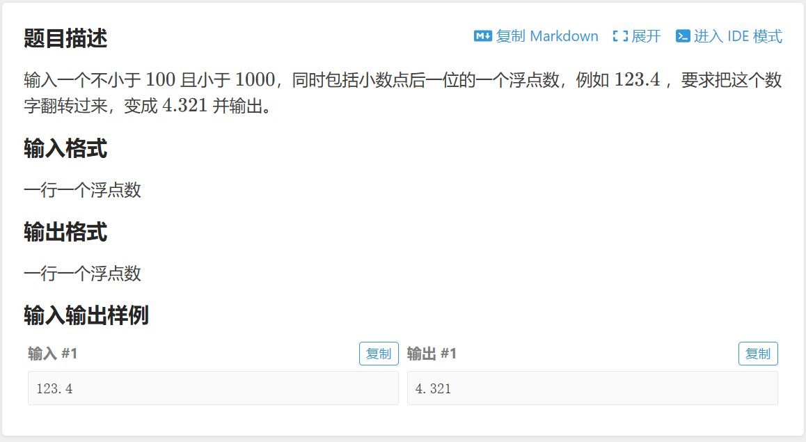 关于这一个题,我看见数字的反转我就先想到利用取模%和除法/依次得到每一位数,但是发现它是一个浮点数,浮点数是不可以进行取模运算的,我就想着直接创建一个int类型的变量c,然后它直接等于输入的浮点数a*10,这样循环遍历,每次c%10就可以得到个位的数,然后输出变量b就是等于b*10+c%10,接着c等于c/10,循环结束的条件为c>0,这样按照样例来说,最后的b就等于了4321,再让b除以1000,就变成了浮点数,然后输出就行。这是我自己理解的方法,代码如下:
