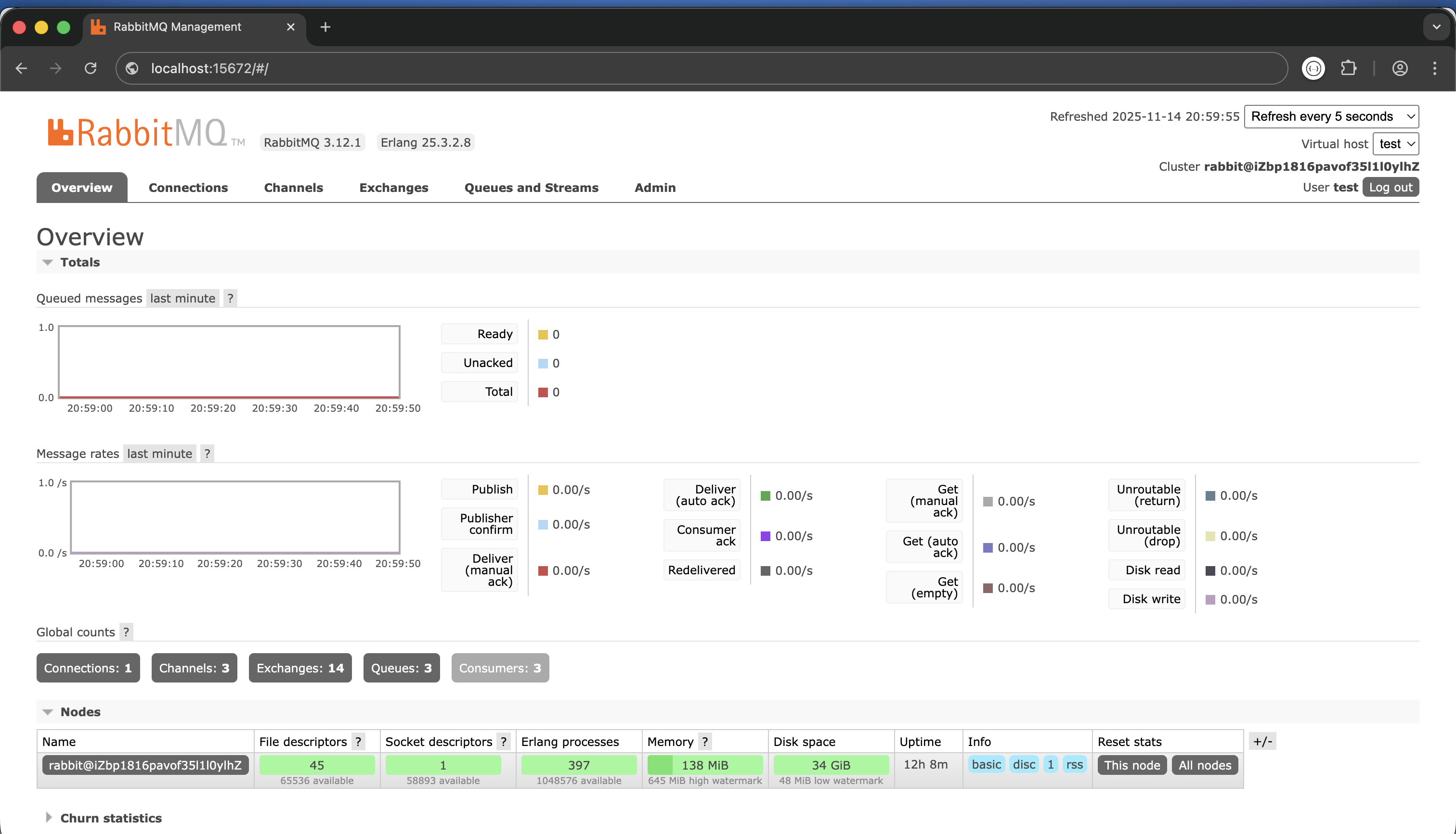 访问管理界面:http://localhost:15672,使用设置的用户名密码登录