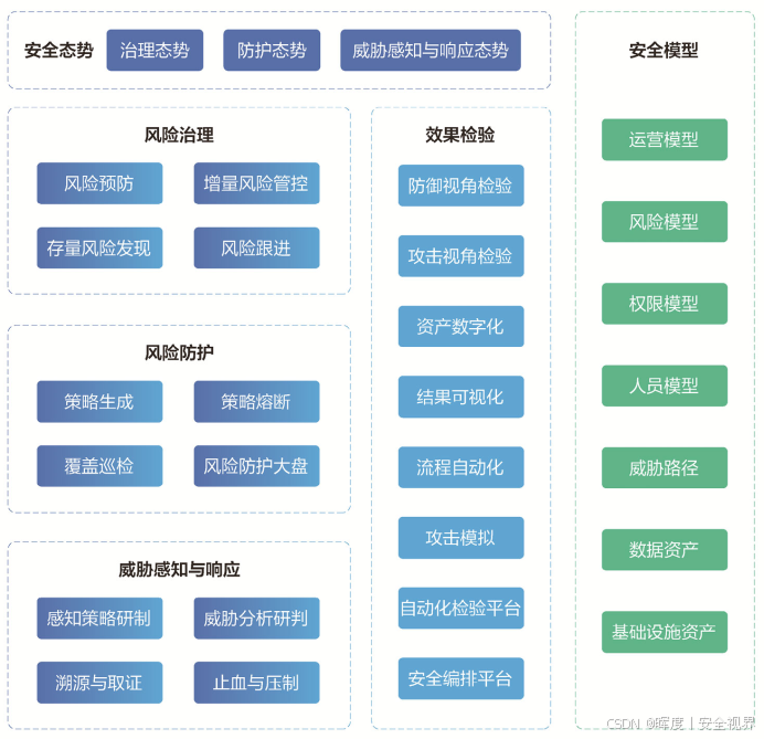 其核心架构可概括为:以全局安全态势为总览,贯穿风险治理、风险防护、威胁感知与响应、效果检验四大运营场景,并由安全模型提供全程的数据支撑。