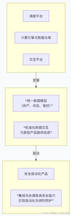 | 数据模型层 | “神经中枢” | 统一数据模型: 1. 资产数字化(网络、主机、应用、权限等)。 2. 状态观测与管控通道标准化(安全数据模型、运营数据模型)。 | 1. 互联互通:作为“神经通路”,连接上层产品与底层数据。 2. 数智底座:是所有智能化、自动化产品的基础与前提。 |
