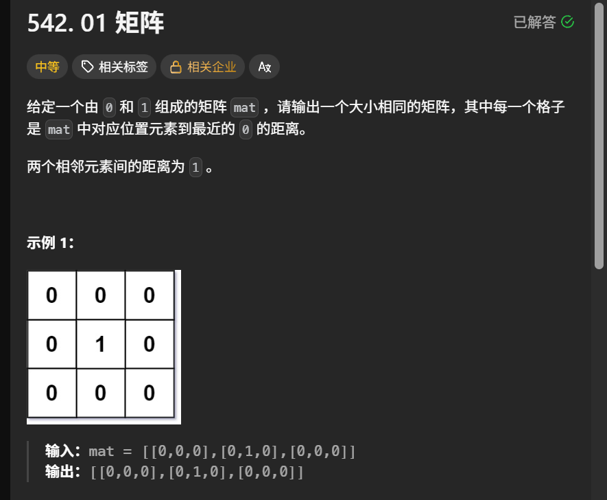public int[][] updateMatrix(int[][] mat) {int m = mat.length;int n = mat[0].length;int[][] ret = new int[m][n];for (int i = 0; i < m; i++) {Arrays.fill(ret[i], -1);}Queue<int[]> queue = new LinkedList<>();for (int y = 0; y < m; y++) {for (int x = 0; x < n; x++) {if (mat[y][x] == 0) {queue.add(new int[]{y, x});ret[y][x] = 0;}}}int[] dy = new int[]{-1, 1, 0, 0};int[] dx = new int[]{0, 0, -1, 1};while (!queue.isEmpty()) {int[] poi = queue.poll();for (int j = 0; j < 4; j++) {int y = poi[0] + dy[j];int x = poi[1] + dx[j];if (y < 0 || y == m || x < 0 || x == n || ret[y][x] != -1 || mat[y][x] == 0) continue;ret[y][x] = ret[poi[0]][poi[1]] + 1;queue.add(new int[]{y, x});}}return ret;}多源bfs的题还有