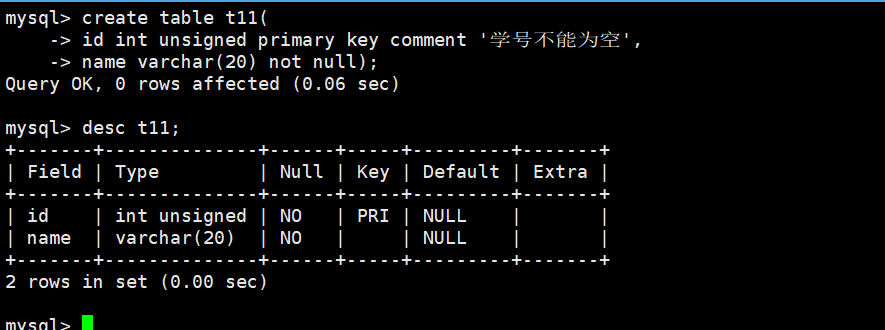 (id int unsigned primary key comment '学号不能为空',name varchar(20) not null