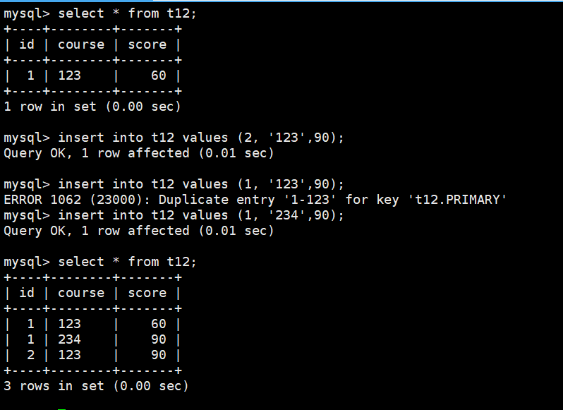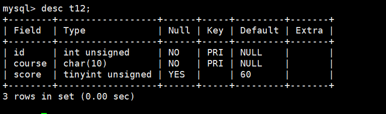 create table t12(id int unsigned,course char(10) comment '课程代码',score tinyint unsigned default 60 comment '成绩',primary key(id,course) -- 注释id 和 course为复合主键