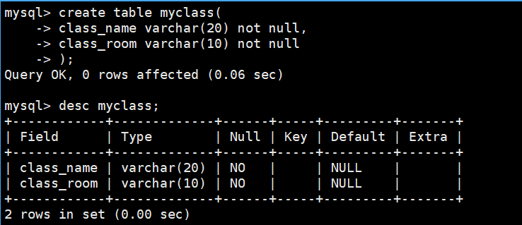 create table myclass(id int primary key,name varchar(30) not null comment '班级名'