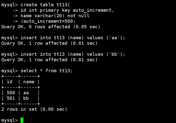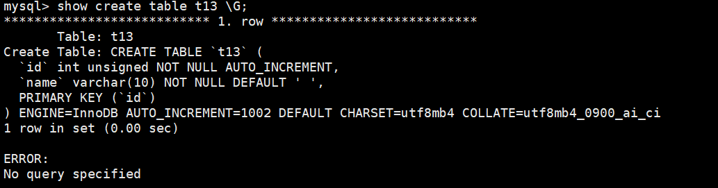 (id int unsigned primary key auto_increment,name varchar(10) not null default " "