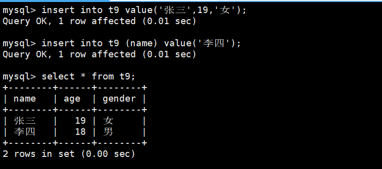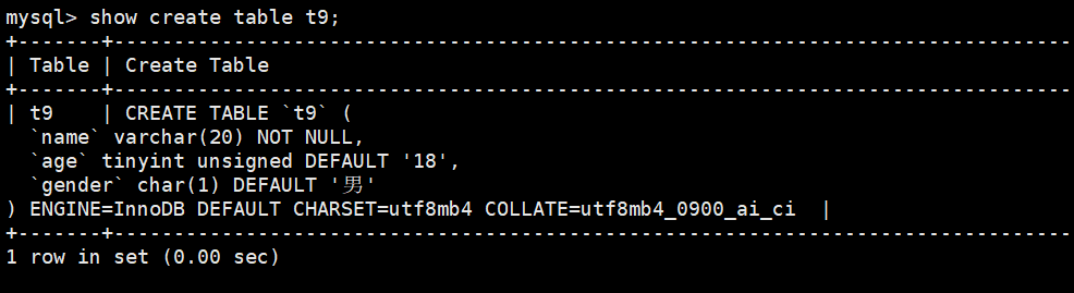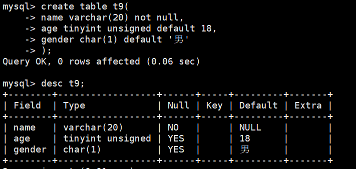 create table t9(name varchar(20) not null,age tinyint unsigned default 18,gender char(1) default '男'