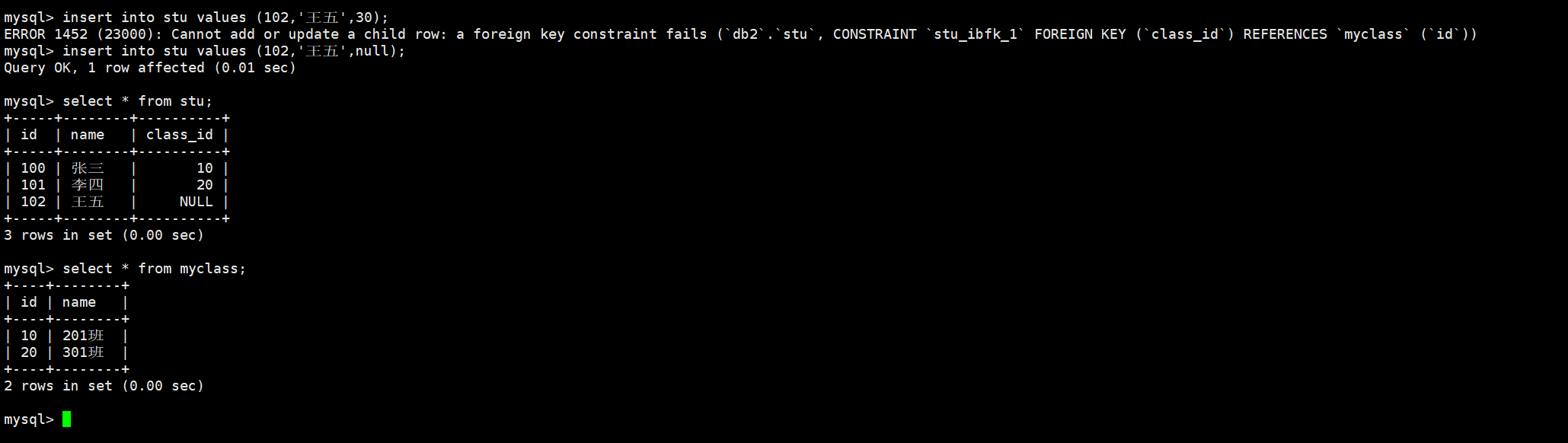 插入一个班级号为30的学生,因为没有这个班级,所以插入不成功