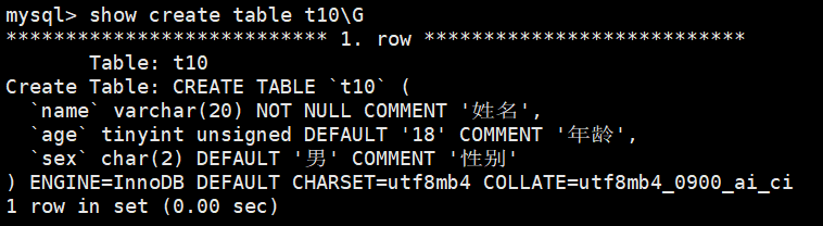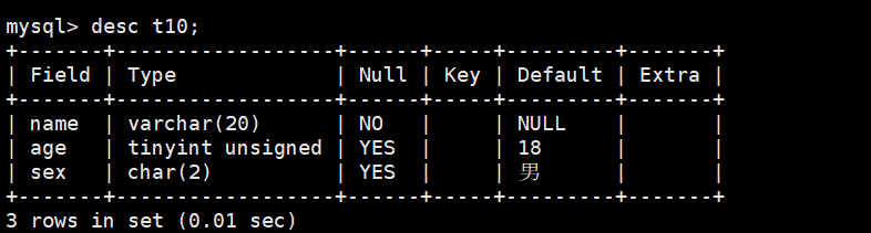 create table t10(name varchar(20) not null comment '姓名',age tinyint unsigned default 18 comment '年龄',sex char(2) default '男' comment '性别'