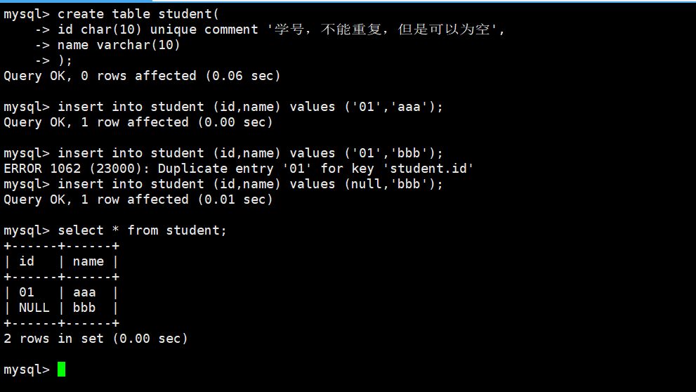 (id char(10) unique comment '学号,不能重复,但是可以为空',name varchar(10)