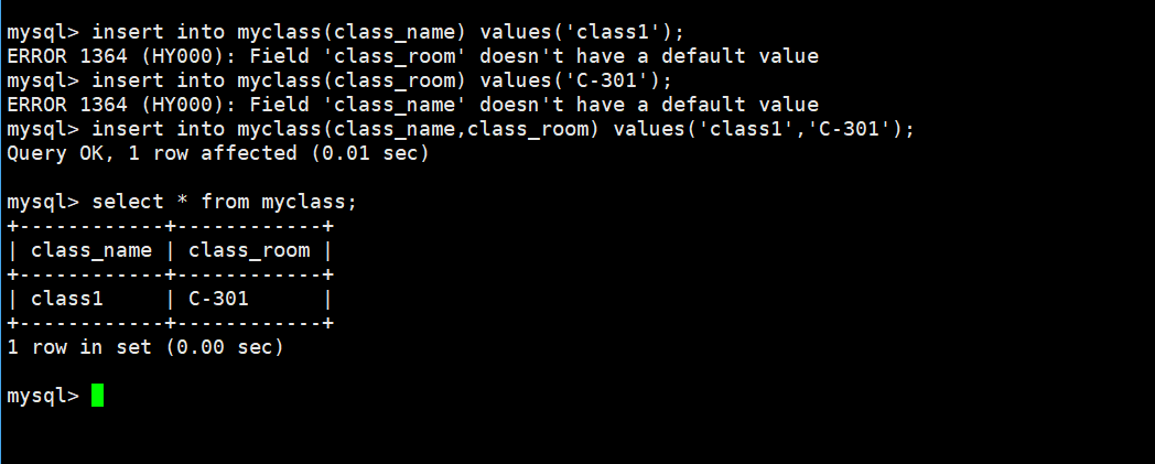 insert into myclass(class_name,class_room) values('class1','C-301');