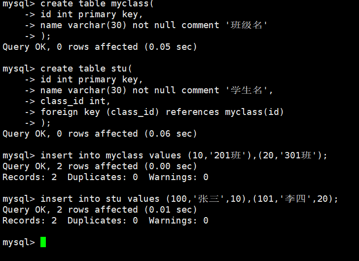 create table stu(id int primary key,name varchar(30) not null comment '学生名',class_id int,foreign key (class_id) references myclass(id)