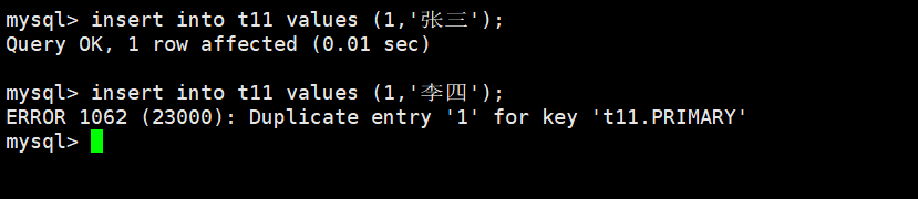 主键对应的字段中不能重复,一旦重复,操作失败。