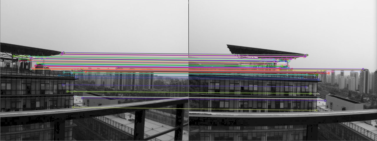 import cv2def main():# 1. 读取图像(灰度模式)img1 = cv2.imread("images/im1.png", cv2.IMREAD_GRAYSCALE)img2 = cv2.imread("images/im2.png", cv2.IMREAD_GRAYSCALE)if img1 is None or img2 is None:print("Error: 无法读取图像,请检查路径!")return# 2. 初始化ORB检测器orb = cv2.ORB_create(nfeatures=1000, # 最大特征点数量scaleFactor=1.2, # 金字塔缩放因子nlevels=8, # 金字塔层数edgeThreshold=31, # 边缘阈值(避免检测边缘点)scoreType=cv2.ORB_HARRIS_SCORE, # 评分类型(HARRIS更均匀)patchSize=31 # 描述符采样窗口大小)# 3. 检测关键点并计算描述符kp1, des1 = orb.detectAndCompute(img1, None)kp2, des2 = orb.detectAndCompute(img2, None)print(f"图像1检测到{len(kp1)}个关键点")print(f"图像2检测到{len(kp2)}个关键点")# 4. 特征匹配(暴力匹配器,适合二进制描述符)matcher = cv2.BFMatcher(cv2.NORM_HAMMING, crossCheck=True) # crossCheck确保双向匹配matches = matcher.match(des1, des2)# 5. 筛选优质匹配(按汉明距离排序,取前100个)matches = sorted(matches, key=lambda x: x.distance)good_matches = matches[:min(100, len(matches))]# 6. 绘制匹配结果display_img = cv2.drawMatches(img1, kp1, img2, kp2, good_matches, None,flags=cv2.DrawMatchesFlags_NOT_DRAW_SINGLE_POINTS # 不绘制单个点)cv2.imshow("display", display_img )cv2.waitKey(0)cv2.destroyAllWindows()if __name__ == "__main__":main()