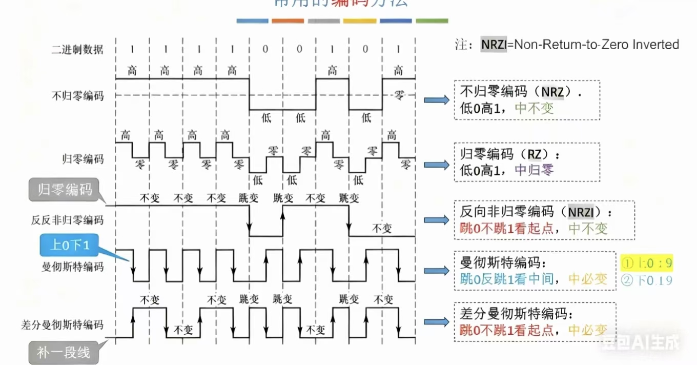 | 曼彻斯特编码 | 每个码元中间必有电平跳变:“前低后高”=0,“前高后低”=1(或反之) | 自同步(跳变提供时钟) | 带宽加倍(码元速率 = 2× 数据率) | 以太网(10BASE-T) |