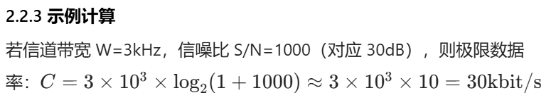 有噪声的信道中,极限信息传输速率(数据率)为:C = W log2(1 + S/N)(bit/s)
