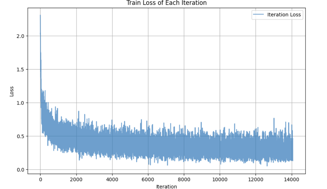 def plot_iteration_loss(losses,indices):plt.figure(figsize=(10,6))plt.plot(indices,losses,alpha=0.7,label='Iteration Loss')plt.xlabel('Iteration')plt.ylabel('Loss')plt.title('Train Loss of Each Iteration')plt.legend()plt.grid(True)plt.show()