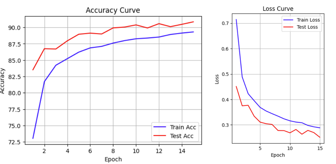 def plot_epoch_metrics(train_acc, test_acc, train_loss, test_loss):epochs = range(1,len(train_acc)+1)plt.figure(figsize=(12,8))# 准确率曲线plt.subplot(1,2,1)plt.plot(epochs,train_acc,color='blue',label='Train Acc')plt.plot(epochs,test_acc,color='red',label='Test Acc')plt.xlabel('Epoch')plt.ylabel('Accuracy')plt.title('Accuracy Curve')plt.legend()plt.grid(True)plt.show()# 损失值曲线plt.subplot(1,2,2)plt.plot(epochs,train_loss,color='blue',label='Train Loss')plt.plot(epochs,test_loss,color='red',label='Test Loss')plt.xlabel('Epoch')plt.ylabel('Loss')plt.title('Loss Curve')plt.legend()plt.grid(True)plt.tight_layout()plt.show()
