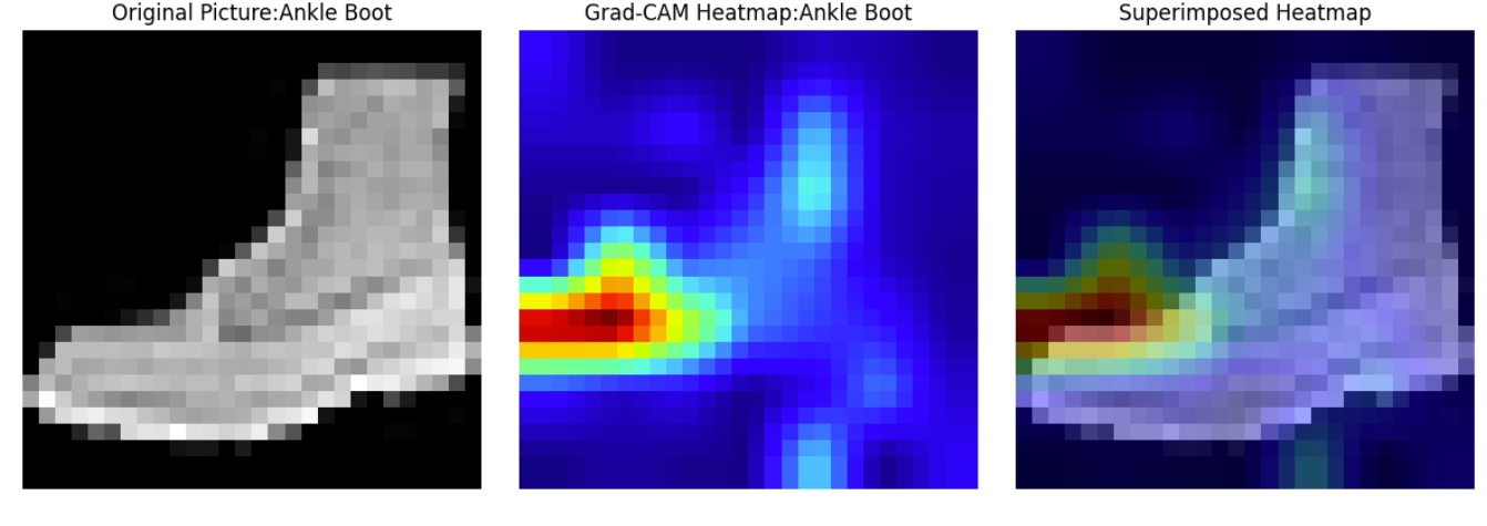 class GradCAM:def __init__(self,model,target_layer):self.model = model # 模型self.target_layer = target_layer # 目标层self.gradients = None # 梯度self.activations = None # 特征图# 注册钩子,用于获取目标层的前向传播输出和反向传播梯度self.register_hooks()def register_hooks(self):def forward_hook(module,input,output): # 参数自动输入self.activations = output.detach()def backward_hook(module,grad_input,grad_output):self.gradients = grad_output[0].detach() # grad_output = (d_loss/d_output,)# 在目标层注册前向钩子和反向钩子self.target_layer.register_forward_hook(forward_hook)self.target_layer.register_backward_hook(backward_hook)def generate_cam(self,input_image,target_class=None):model_output = self.model(input_image) # 前向传播# 目标类别if target_class is None: # 没有指定目标类别target_class = torch.argmax(model_output,dim=1).item() #选取模型预测概率最大的作为目标类别self.model.zero_grad() # 清除梯度# 构造one-hot向量,使得目标类别对应的梯度为1,其余为0,然后进行反向传播计算梯度one_hot = torch.zeros_like(model_output) # 与model_output大小相同的全零张量one_hot[0,target_class] = 1 # 目标类别对应的梯度为1,其余为0model_output.backward(gradient=one_hot) # 突出目标类别# 获取之前保存的目标层的梯度和激活值gradients = self.gradientsactivations = self.activations# 计算权重:对梯度进行全局平均池化,得到每个通道的权重,用于衡量每个通道的重要性weights = torch.mean(gradients,dim=(2,3),keepdim=True)# 加权激活映射:将权重与激活值相乘并求和,得到类激活映射的初步结果cam = torch.sum(gradients*weights,dim=1,keepdim=True)# ReLU激活,只保留对目标类别有正贡献的区域,去除负贡献的影响cam = F.relu(cam)# 调整大小并归一化,将类激活映射调整为与输入图像相同的尺寸(32x32),并归一化到[0, 1]范围cam = F.interpolate(cam,size=(28,28),mode='bilinear',align_corners=False)cam = cam - cam.min()cam = cam / cam.max() if cam.max() > 0 else cam# cam.cpu().squeeze().numpy():将张量从GPU移到CPU,然后移除所有大小为1的维度,再转换为数组return cam.cpu().squeeze().numpy(),target_class