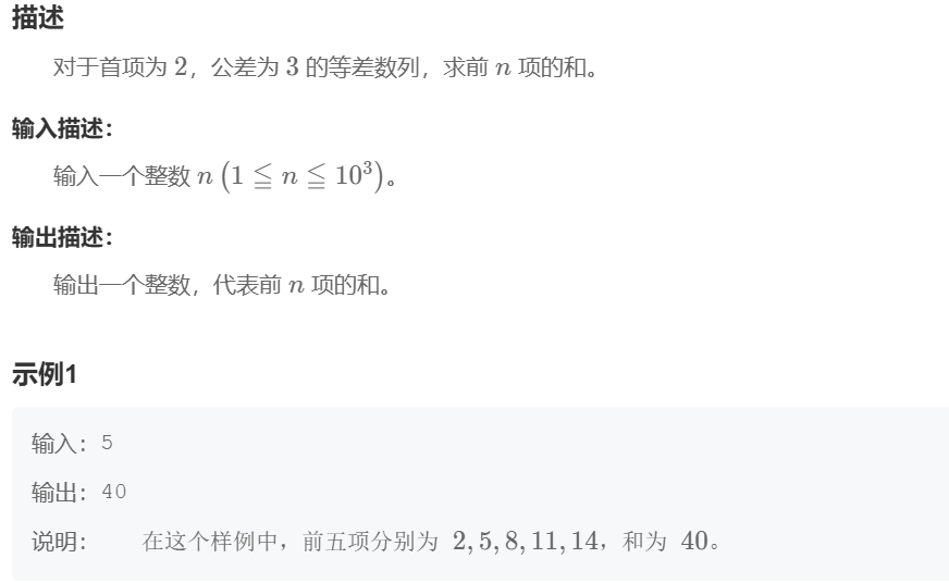 public static void main(String[] args) {Scanner scanner = new Scanner(System.in);int n = scanner.nextInt();// 使用等差数列求和公式int sum = n * 2 + n * (n - 1) * 3 / 2;System.out.println(sum);}