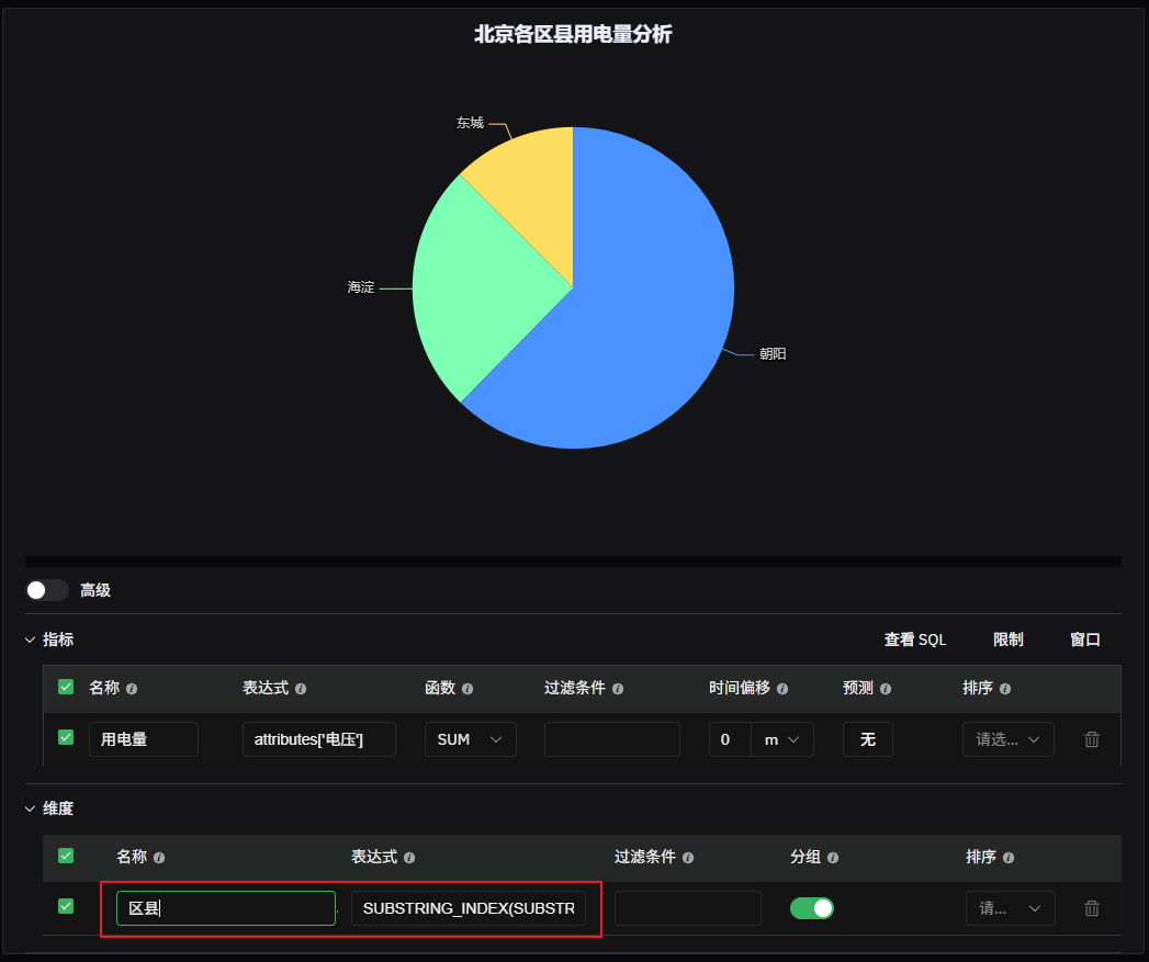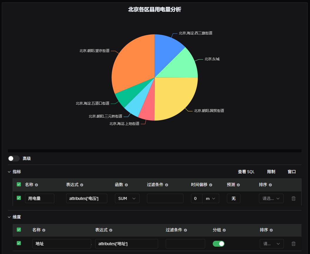 饼图往往遇到一个问题是,聚合的粒度不是自己期望的。比如在“公共事业”示例数据下,在元素“北京”下创建饼图,想分析北京下各区县的用电量占比,但是按照地址去聚合时,则得到以下结果,不是我们期望的。
