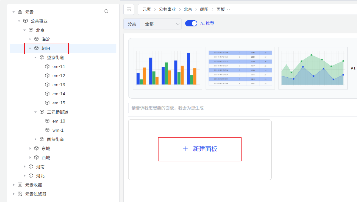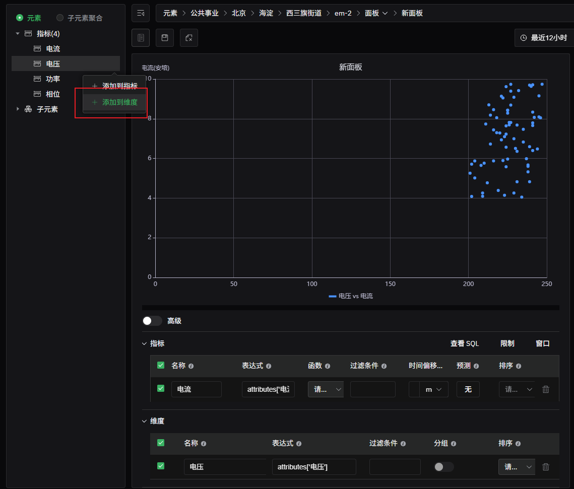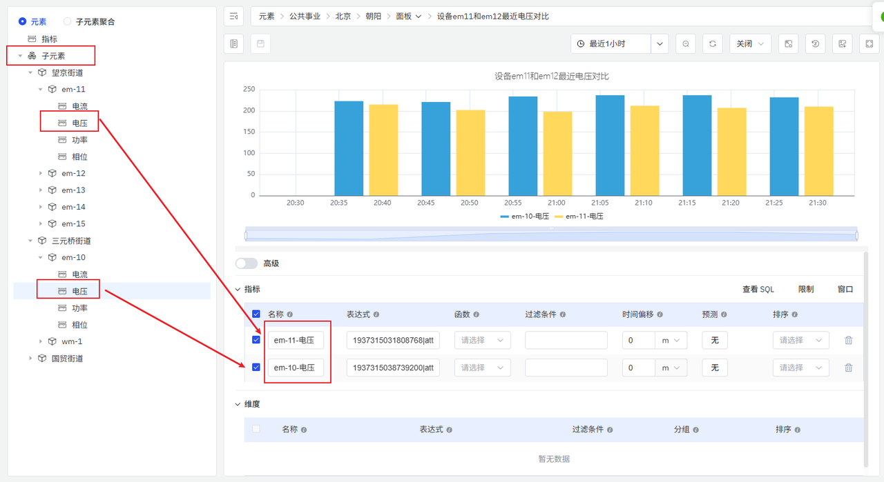 想对别两个元素的同一个指标,比如比较两个智能电表的电压。应该在这两个元素的共同祖先上创建面板。如图: