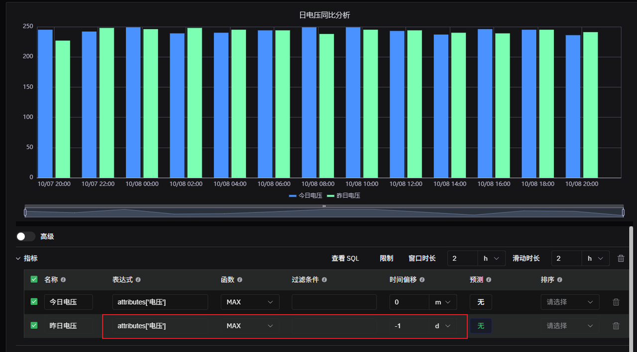 要开启同比分析,可以添加同样的指标两次;设置第二次指标的时间偏移。如下图,如果要对昨日的指标进行同比分析,则可以设置[-1d]的时间偏移。