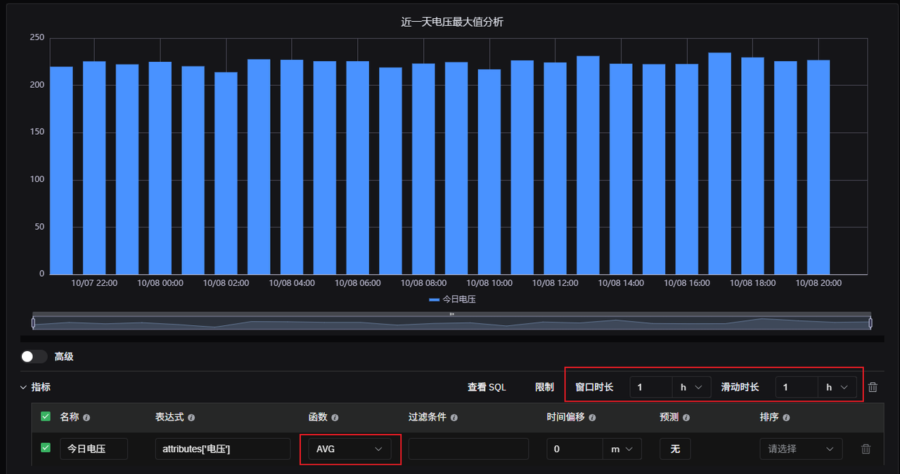 时序数据可能采集频率为秒级,如果想看每小时的统计数据,可以开启窗口并设置指标的聚合函数。如下图,设置聚合每个小时的电压采集数据,计算平均值。