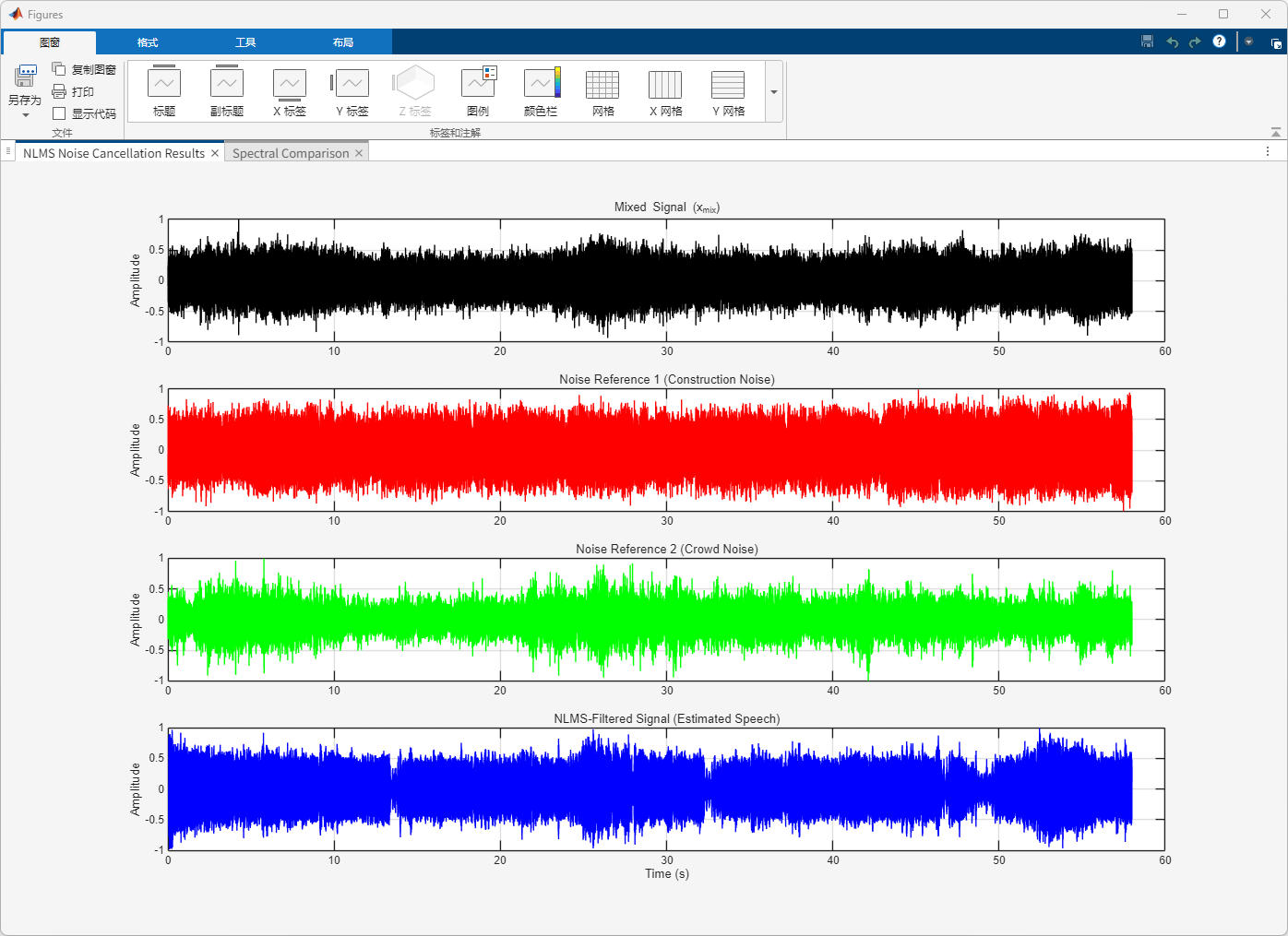 摘要:随着音频信号处理的需求增加,噪声消除成为语音处理中的关键问题。本文基于归一化最小均方(NLMS)算法,提出了一种自适应噪声消除方法,并通过MATLAB实现。首先,利用NLMS算法从含噪信号中提取目标信号,并通过诺奇滤波器去除特定频率干扰。实验结果表明,该方法有效提高了信噪比(SNR)并在不同噪声环境中表现出良好的适应性。本文为实时噪声消除系统的开发提供了有效方案,并为进一步提高噪声消除精度提供了参考。