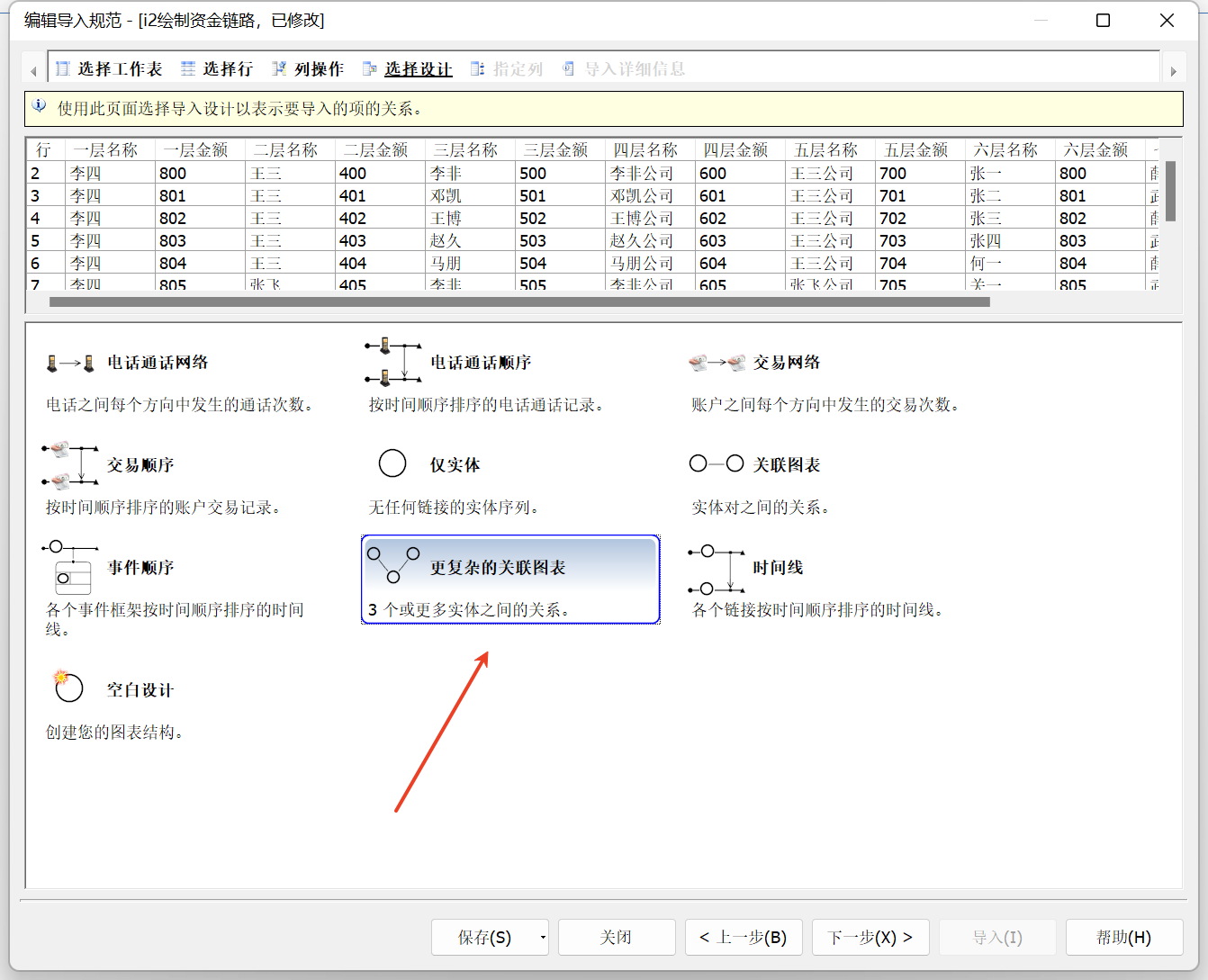 1.创建更复杂的关联图表:将数据导入,选择创建更复杂的关联图表,如图所示: