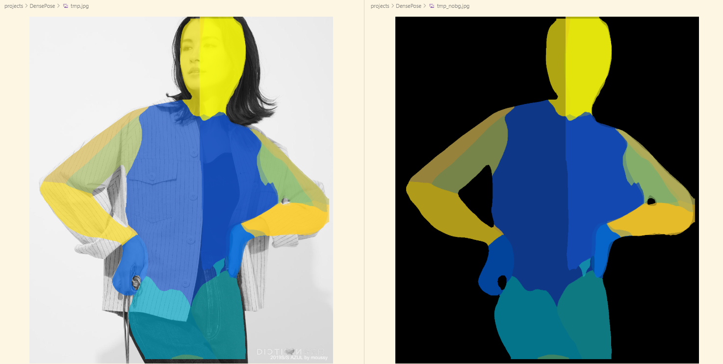 }def get_dp_predictor():config_fpath = 'configs/densepose_rcnn_R_50_FPN_s1x.yaml'model_fpath = 'model_final_162be9.pkl'opts = []cfg = get_cfg()add_densepose_config(cfg)cfg.merge_from_file(config_fpath)cfg.merge_from_list(opts)cfg.MODEL.WEIGHTS = model_fpathcfg.freeze()predictor = DefaultPredictor(cfg)return cfg, predictordef get_outputs_by_predictor(dp_predictor, img_pil):import numpy as npimport cv2img_np = np.array(img_pil)img = cv2.cvtColor(img_np, cv2.COLOR_RGB2BGR)with torch.no_grad():outputs = dp_predictor(img)["instances"]return outputsdef create_context(cfg) -> Dict[str, Any]:visualizers = []extractors = []texture_atlas = get_texture_atlas(None)texture_atlases_dict = get_texture_atlases(None)vis = VISUALIZERS['dp_segm'](cfg=cfg,texture_atlas=texture_atlas,texture_atlases_dict=texture_atlases_dict,)visualizers.append(vis)extractor = create_extractor(vis)extractors.append(extractor)visualizer = CompoundVisualizer(visualizers)extractor = CompoundExtractor(extractors)context = {"extractor": extractor,"visualizer": visualizer,"entry_idx": 0,}return contextdef execute_on_outputs(context: Dict[str, Any], outputs, img_pil,