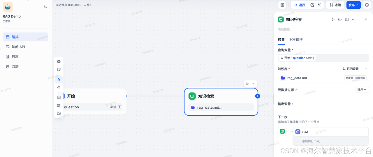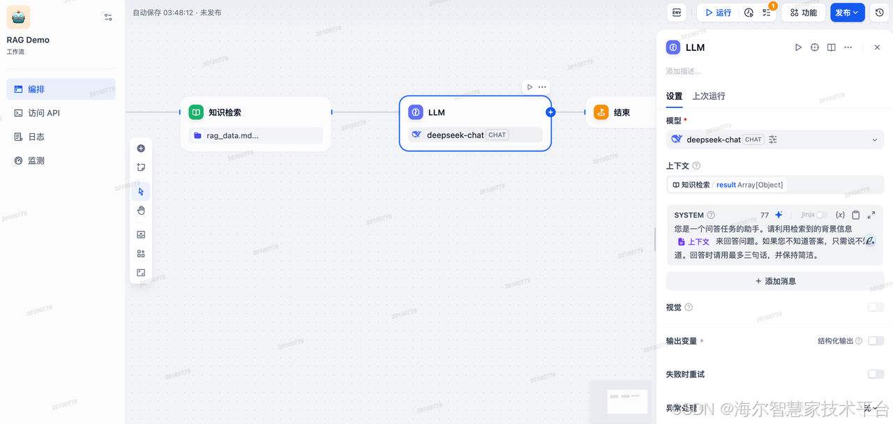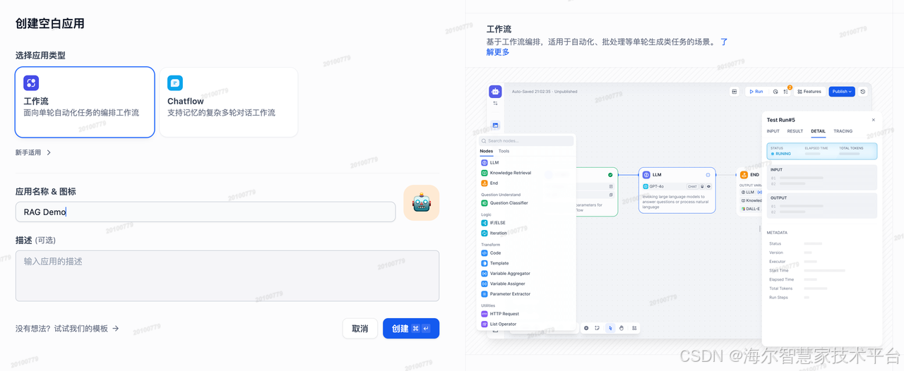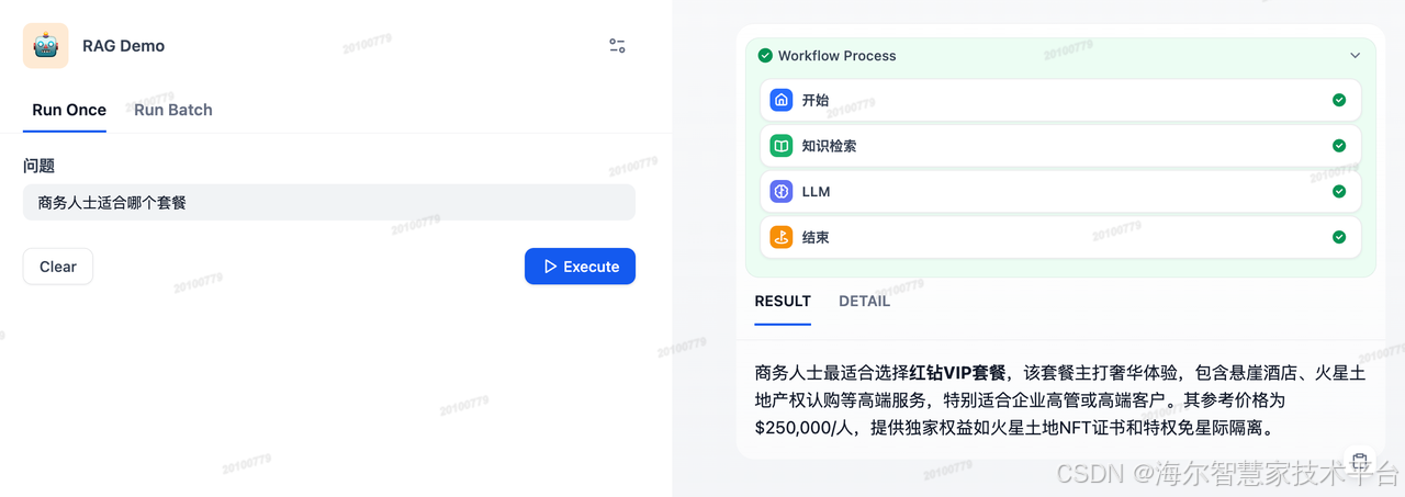 # {'answer': '商务人士适合**红钻VIP套餐**,该套餐专为企业高管/高端客户设计,提供奢华体验,包括火星土地产权和双月音乐会等独家权益。其体力要求中等,以艺术创作为主,参考价格为$250,000/人。'}6.2.3 基于 Dify 构建