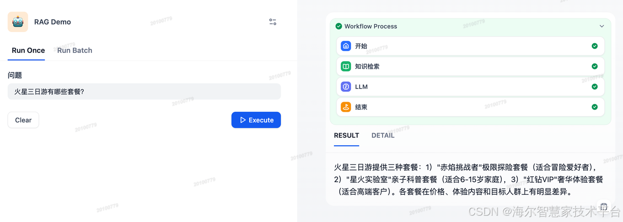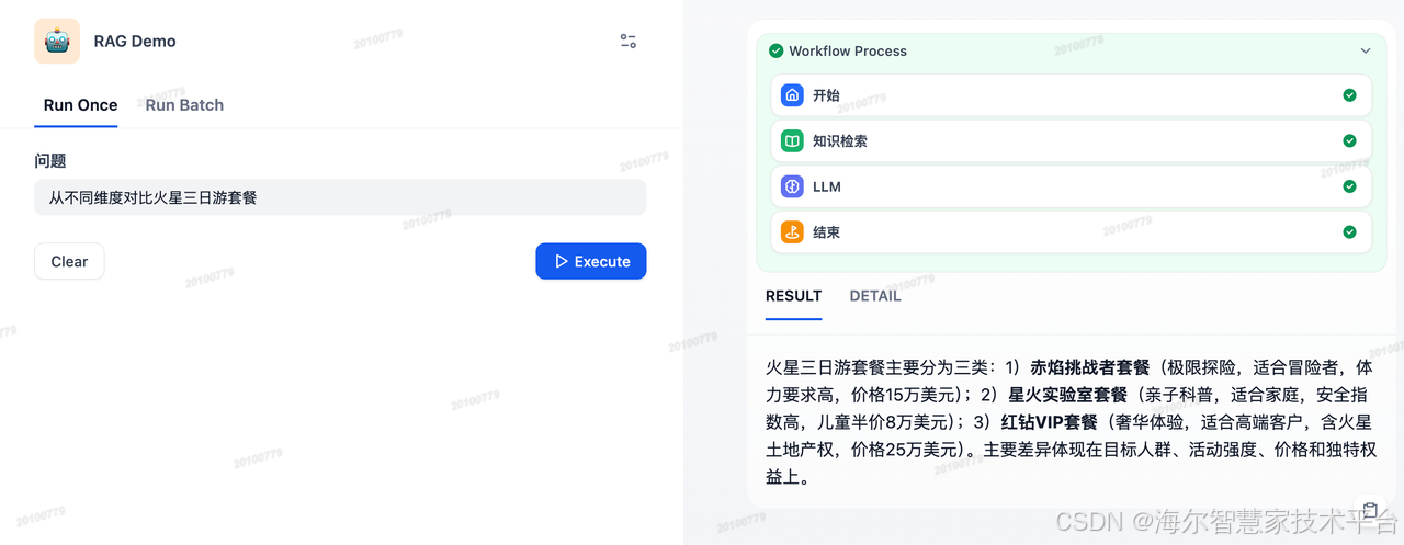 )prompt = hub.pull("rlm/rag-prompt")def generate(query: str):docs_content = vector_db.similarity_search(query, k=3)messages = prompt.invoke({"question": query, "context": docs_content})response = llm.invoke(messages)print({"answer": response.content})generate("火星三日游有哪些套餐?")