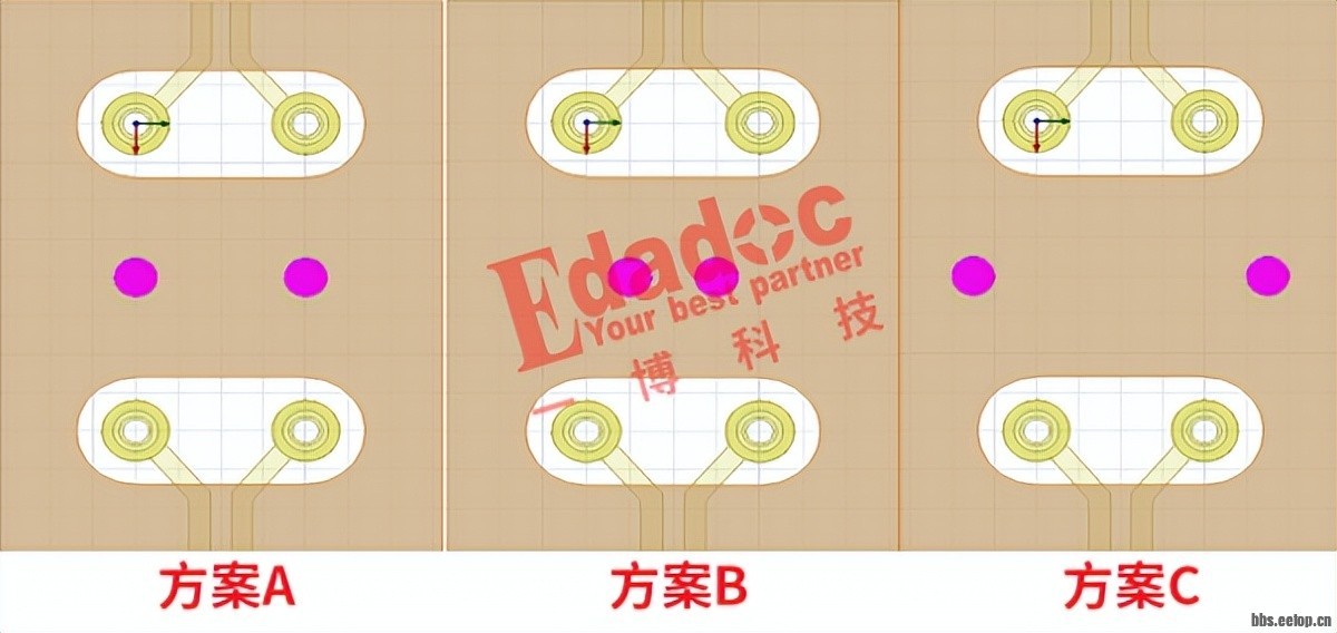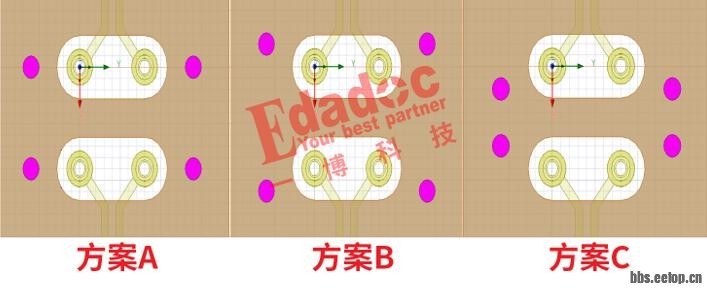 相信大部分会选择方案A的方式吧,把地过孔打在信号过孔水平方向的左右两边。对比方案A,方案B就是在竖直分别往上下远离点来打,方案C就是在竖直方向分别往上下靠近点来打。各位设计工程师你们觉得上面三种方案的串扰到底哪种好呢?