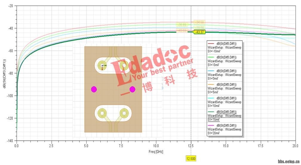 罢了罢了,各位感性的朋友们,Chris还是通过相对比较理性的仿真结果来告诉你们吧。我们从方案B的远离的方案慢慢的往方案C的靠近的方案去扫描,仿真结果告诉我们的是,方案C的地过孔靠近的方案串扰是最好的,如下图: