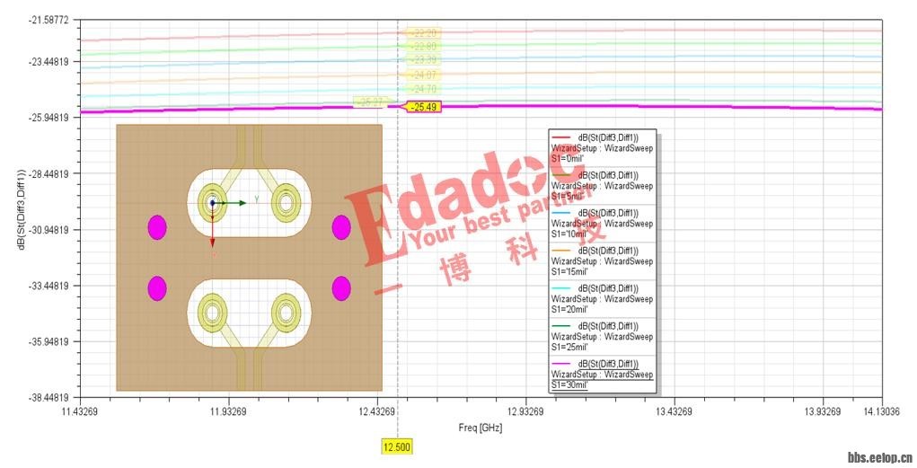 主要是上面第一个case之后得到的灵感,也就是隔离地过孔越靠近,串扰越好。然而,仿真扫描后的结果又会让大家再跌一次眼镜。对从近到远的地过孔位置进行扫描,发现靠近的是最差的(红色曲线),远离的这种反而是串扰最好的设计。