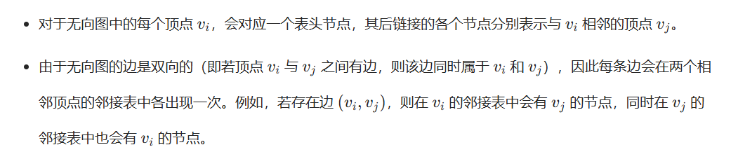这种存储方式能够高效地表示图的结构,便于遍历顶点的邻接节点,且空间复杂度与图的边数相关(对于有 e 条边的无向图,邻接表中共有 2e 个节点)