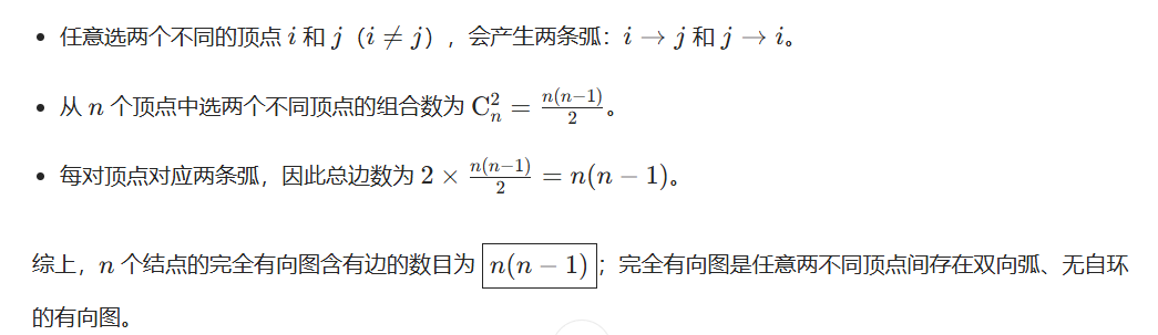 完全有向图是指:对于具有 n 个顶点的有向图,任意两个不同的顶点之间都存在两条方向相反的弧(即从顶点 i 到顶点 j 有一条弧,同时从顶点 j 到顶点 i 也有一条弧),且不存在自环(顶点到自身的弧)。