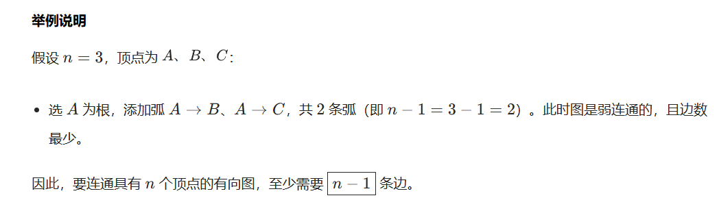 - 这种结构中,弧的数量恰好是 n - 1 条,且能保证所有顶点互相可达(忽略方向时连通,即弱连通)。