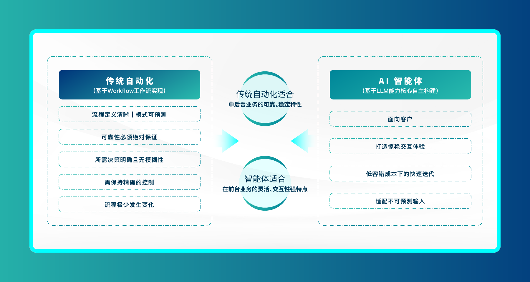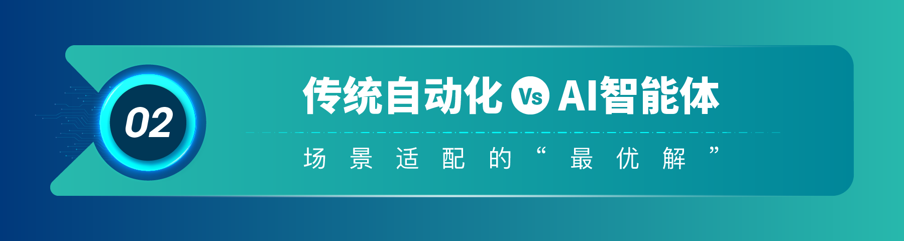 自动化技术的演进并非“二选一”的替代博弈,而是根据业务场景的特性,精准选择适配技术的效能匹配艺术。企业需锚定场景需求——中后台流程依赖传统自动化保障稳定可靠,前台交互场景依托AI智能体突破体验边界,唯有如此,才能在自动化浪潮中实现全链路效能的最大化跃迁。简言之,没有“万能的自动化技术”,只有“场景适配的最优解”。