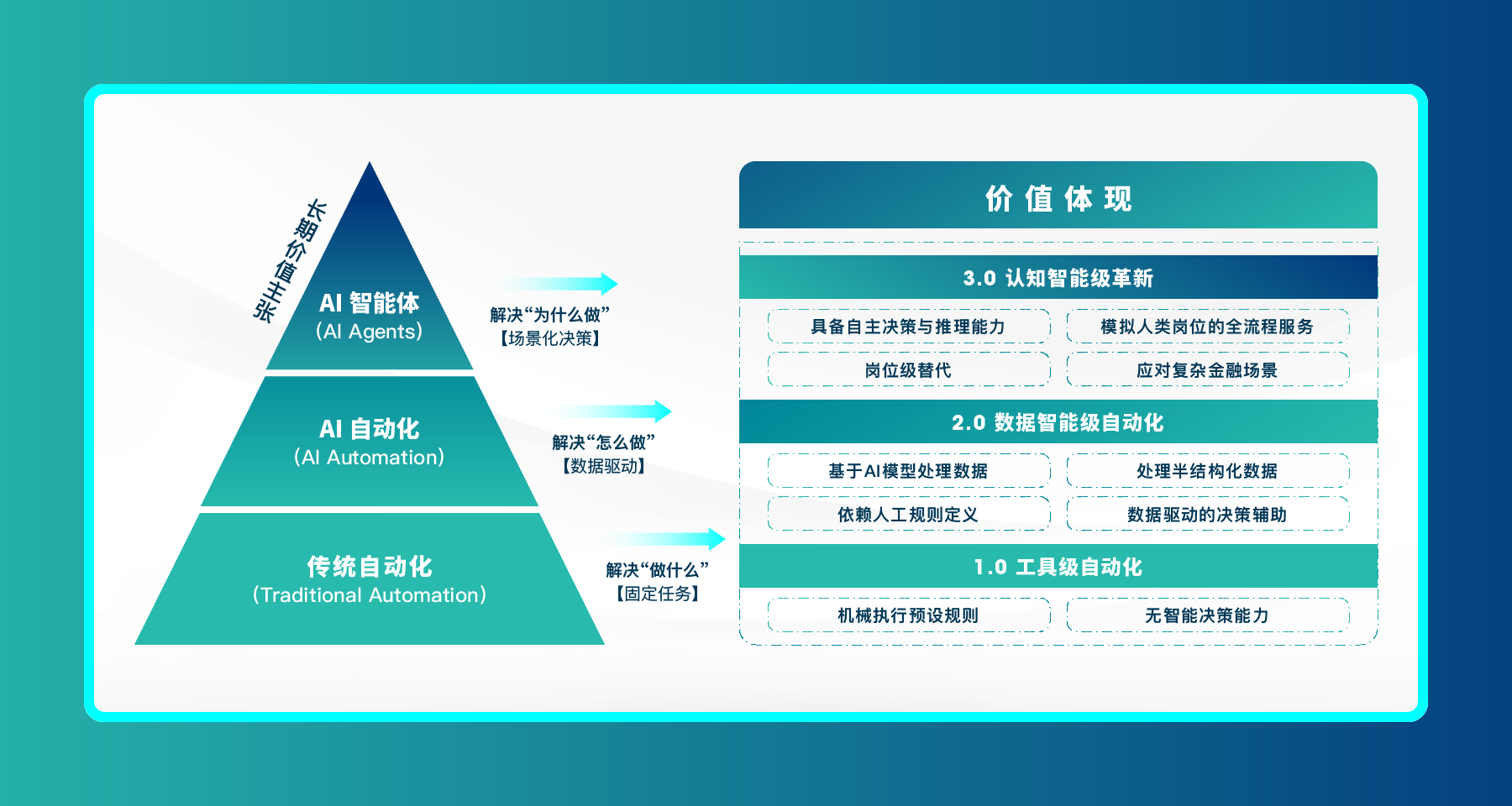自动化技术并非单一形态,而是呈现“传统自动化→AI自动化→AI智能体”的三级金字塔结构,每一层都解决不同维度的问题,创造差异化价值:
