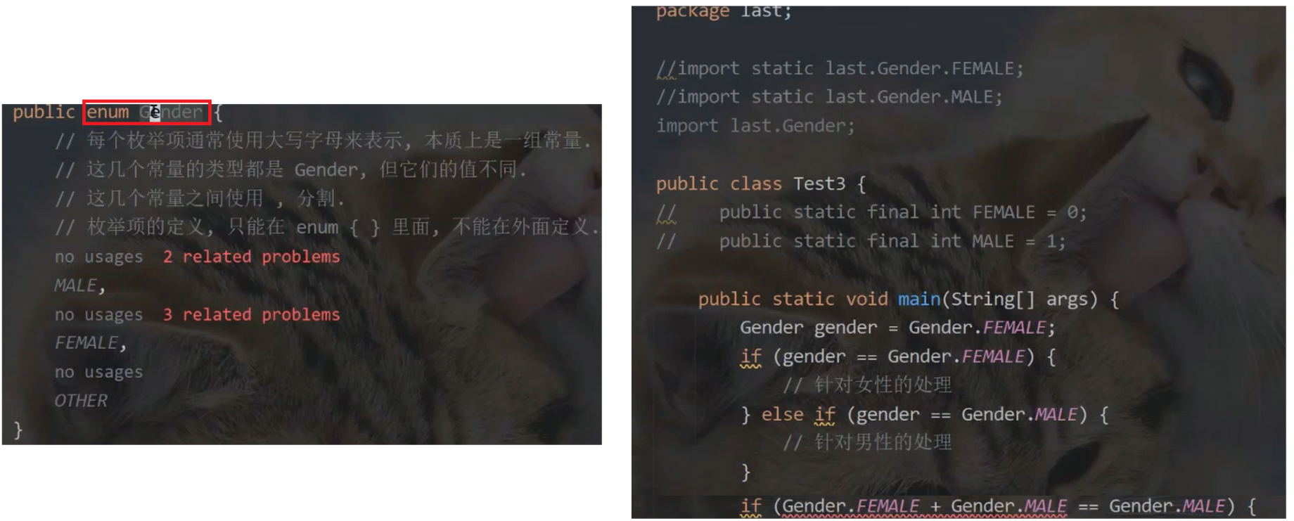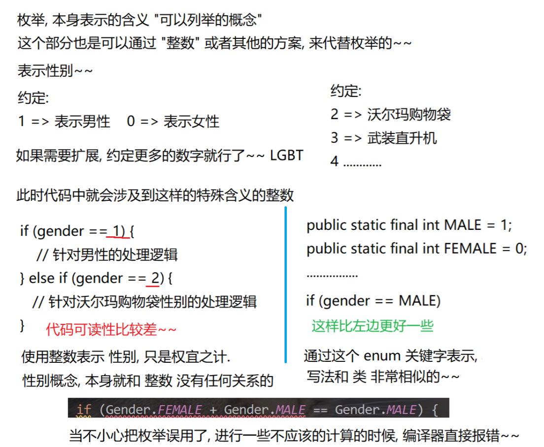 package last;public class Test3 {public static final int FEMALE = 0;public static final int MALE = 1;public static void main(String[] args) {Gender gender = Gender.FEMALE;if (gender == Gender.FEMALE) {// 针对女性的处理} else if (gender == Gender.MALE) {// 针对男性的处理}// 上述代码可能会被误用.if (Gender.FEMALE + Gender.MALE == Gender.MALE) {// 从逻辑上来说, 不合理!! 性别不能进行 算术运算.// 但是这个逻辑从语法上来说, 不会出现任何报错!!}}