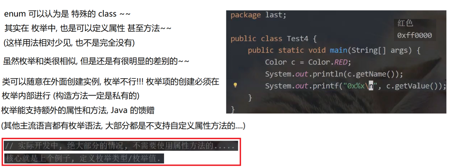 package last;public enum Color {RED("红色", 0xff0000), GREEN("绿色", 0x00ff00), BLUE("蓝色", 0x0000ff);// 实际开发中, 绝大部分的情况, 不需要使用属性方法的..... 核心就是上个例子, 定义枚举类型/枚举值.private String name;private int value;// 构造方法, 指定枚举的属性值.Color(String name, int value) {this.name = name;this.value = value;}public String getName() {return name;}public int getValue() {return value;}