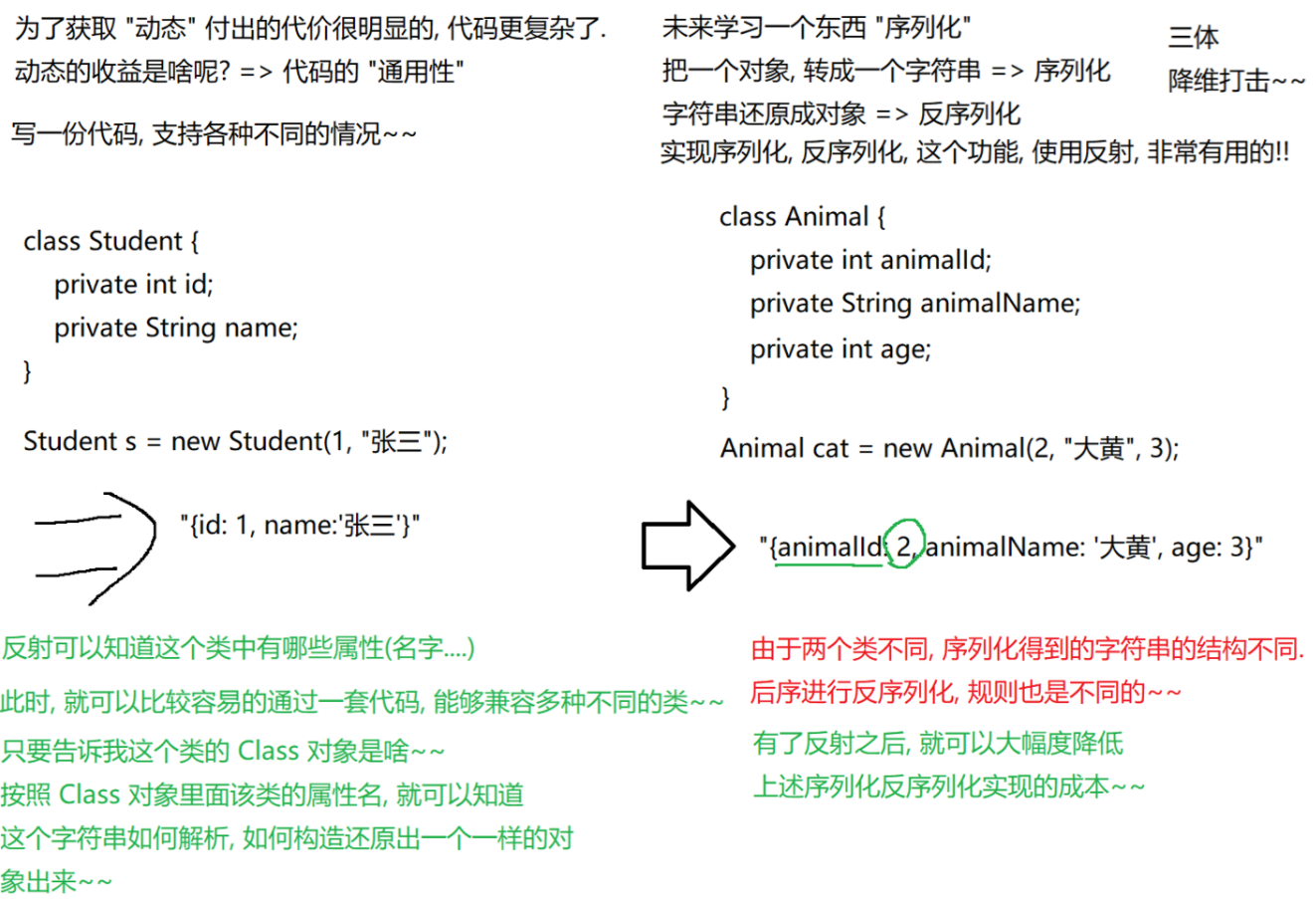 }public class Test2 {private static void test1() throws ClassNotFoundException, NoSuchFieldException, IllegalAccessException {// 通过反射, 获取到 Student 类中的 私有属性 .// 1. 获取到 Student 类的 Class 对象Class studentClass = Class.forName("last.Student");// 2. 拿到上面的 id 属性Field idField = studentClass.getDeclaredField("id");// 3. 创建一个对象出来. 怎么创建无所谓.Student student = new Student();// 直接这样访问, 由于 id 是 private, 肯定不行的.// System.out.println(student.id);// 4. 借助反射完成上述的操作. 相当于 "开锁"idField.setAccessible(true);// 先设置一下这里的值.idField.setInt(student, 100);// 再获取一下值.int id = idField.getInt(student);System.out.println(id);}private static void test2() throws ClassNotFoundException, NoSuchMethodException, InvocationTargetException, IllegalAccessException {// 通过反射调用 Student 的方法// Class studentClass = Class.forName("last.Student");// 这个写法也能拿到 类对象. 更简单; 失去了 类名 的动态能力.Class studentClass = Student.class;// 1. 拿到方法对象Method printMethod = studentClass.getDeclaredMethod("print", String.class);// 2. 创建对象Student student = new Student();// 3. 设置可访问 (如果本来是 public 的, 这里可以不用设置)printMethod.setAccessible(true);// 4. 调用方法printMethod.invoke(student, "Hello, ");}public static void main(String[] args) throws ClassNotFoundException, NoSuchFieldException, IllegalAccessException, InvocationTargetException, NoSuchMethodException {test2();}