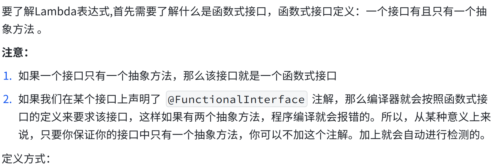(3)方法体:可以是表达式也可以代码块,是函数式接口里方法的实现。代码块可返回一个值或者什么都不返回,这里的代码块块等同于方法的方法体。如果是表达式,也可以返回一个值或者什么都不返回。