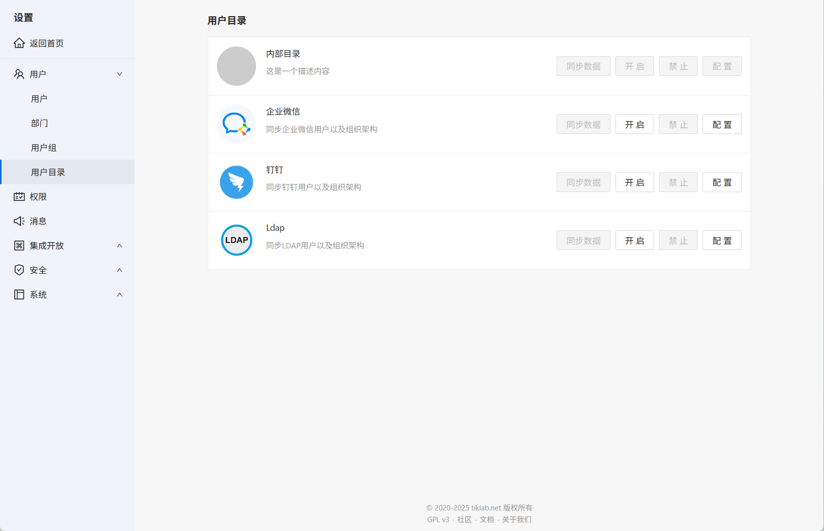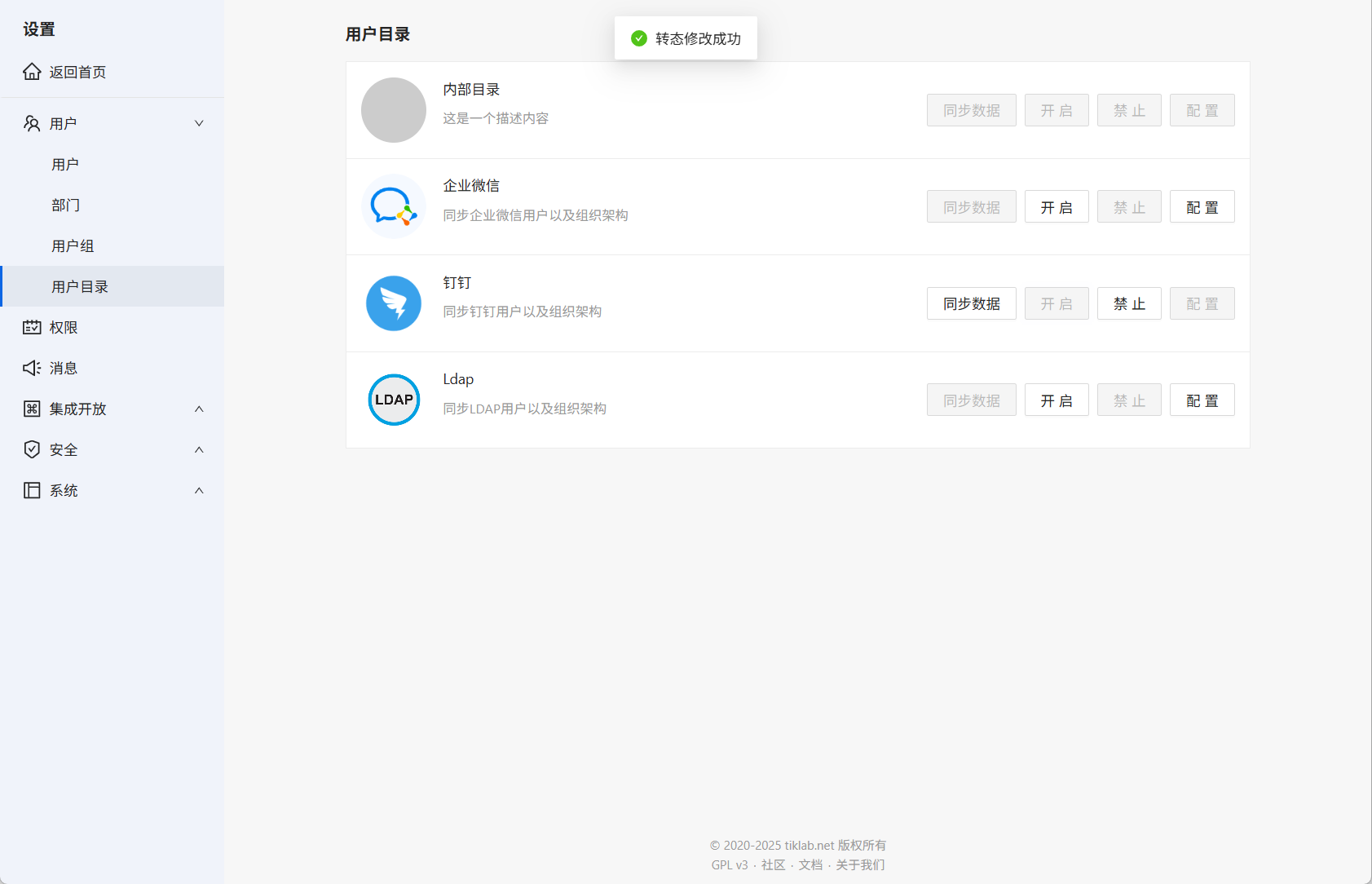 4.配置完成后点击开启,在点击同步数据即可,这样钉钉的用户/用户组即可导入至GitPuk中